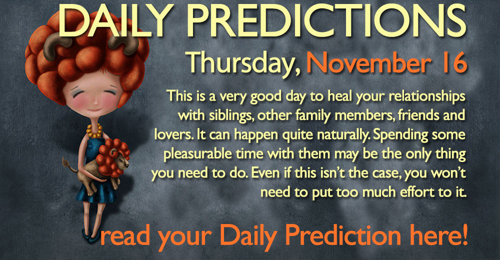 General Daily Predictions: Today, Moon from Libra forms a hexagon with Saturn in Sagittarius. Then, from Scorpio it will conjunct Jupiter. This aspect is perfectly accurate at 00:02 of the 17th of the month, but it will bless half the day today. Depending on where you are living, even the whole day may be blessed by this aspect. The Moon today doesn’t form any negative aspects, but it will be void of course for almost seven and a half hours, from 00:50 to 8:19 UT.